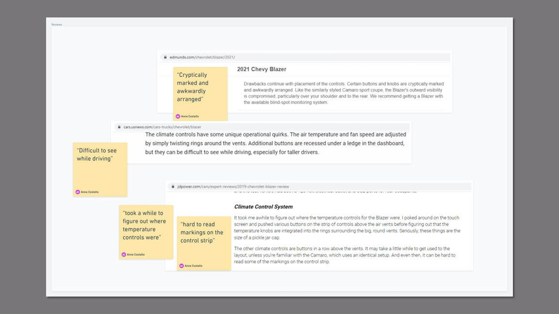 I conducted 30 minute phone interviews with five professionals who drive recent model Chevy Blazers, use the CarPlay app, and commute 20 - 45 minutes one way. In addition, I read several reviews of the Chevy Blazer to corroborate some of my findings.
