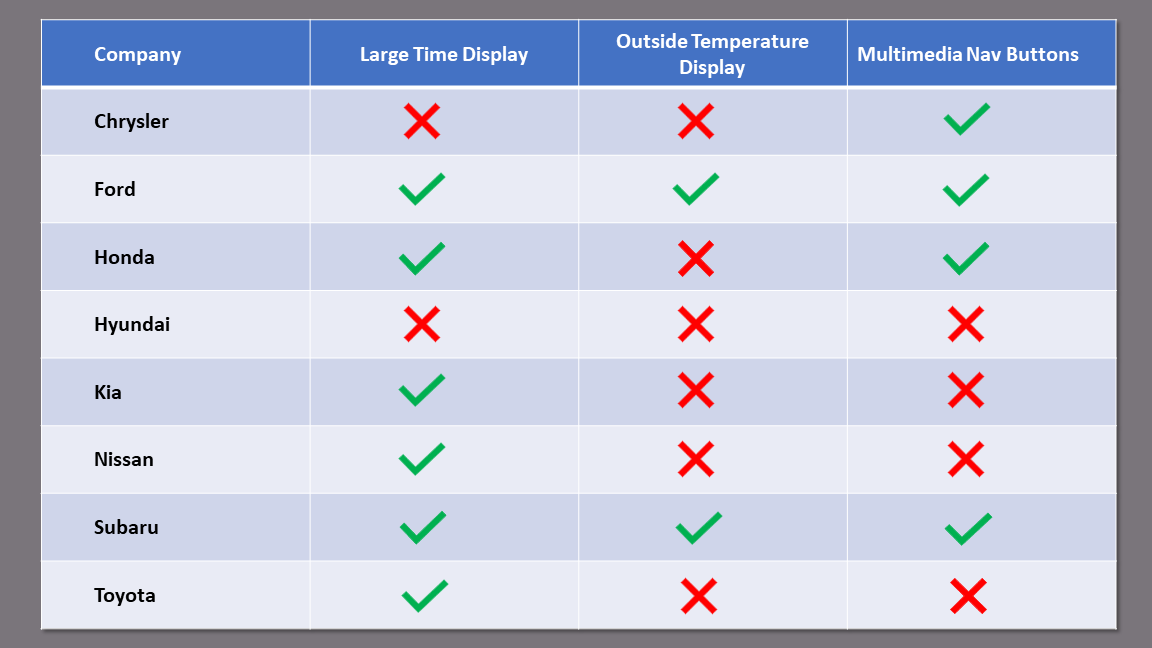 Two of the competitors, Ford and Subaru, had all three features.