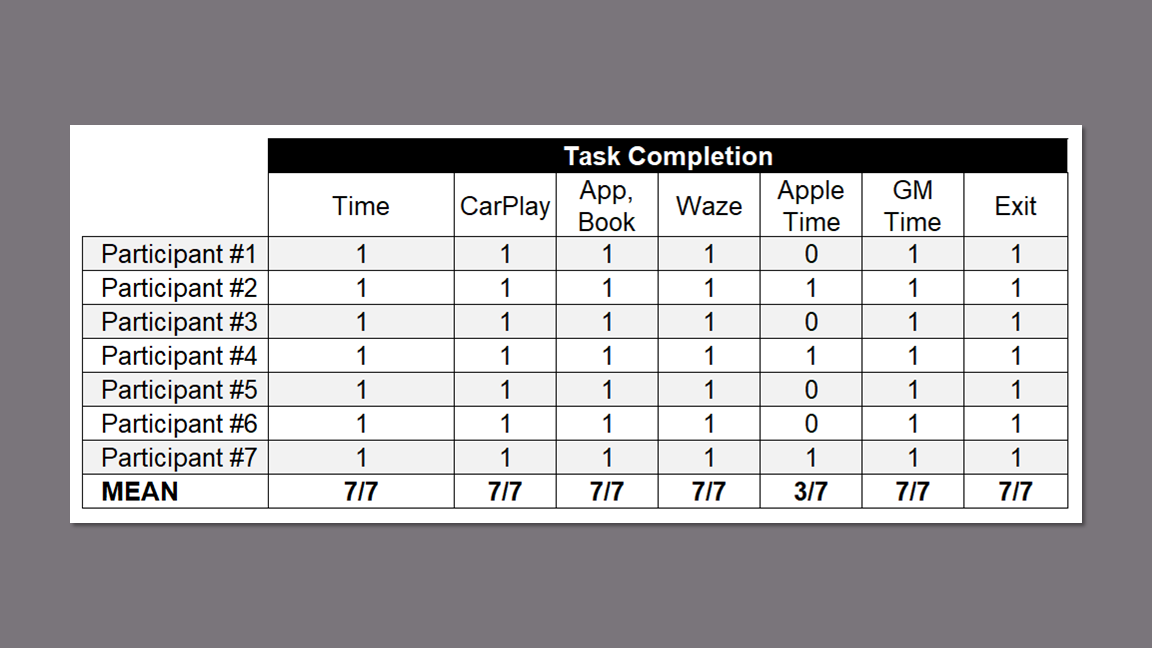 I recorded baseline data for button identification during the first round of usability testing as a baseline comparison for the second round after updating the OnStar and climate control buttons. There was no need for comparison on task completion since the success rate was 100% except for the Apple Time which is part of the iOS and not the multimedia display.