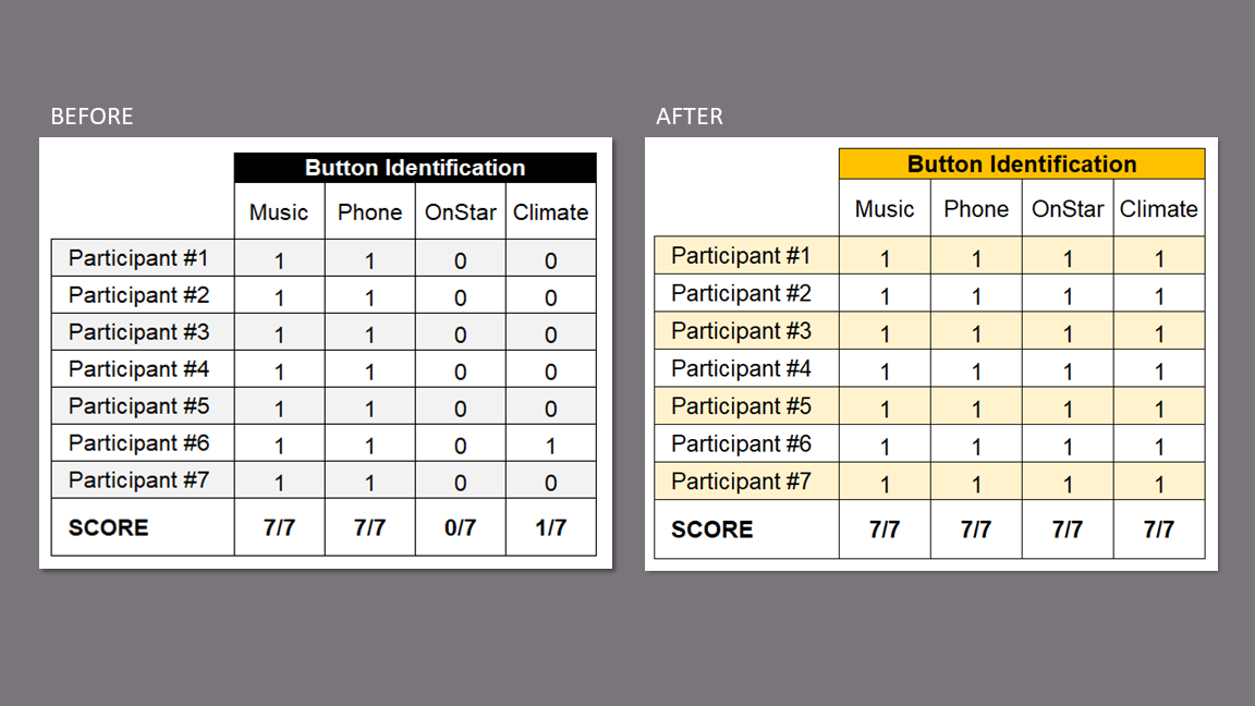 After updating the buttons, all users were able to identify the OnStar and Climate buttons, an overall identification improvement of 46%.
