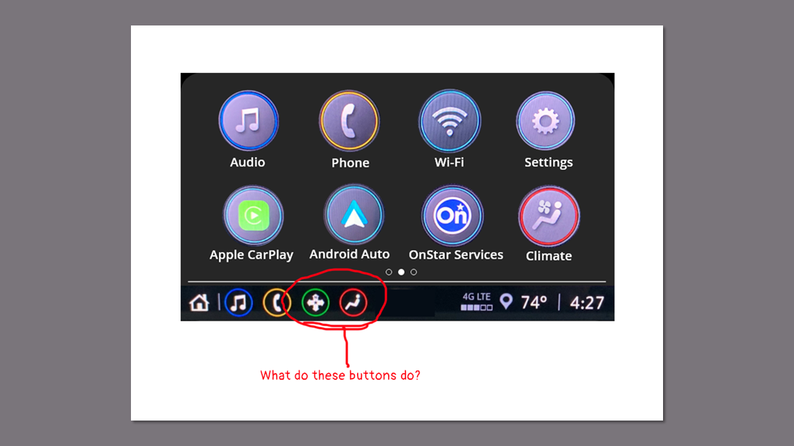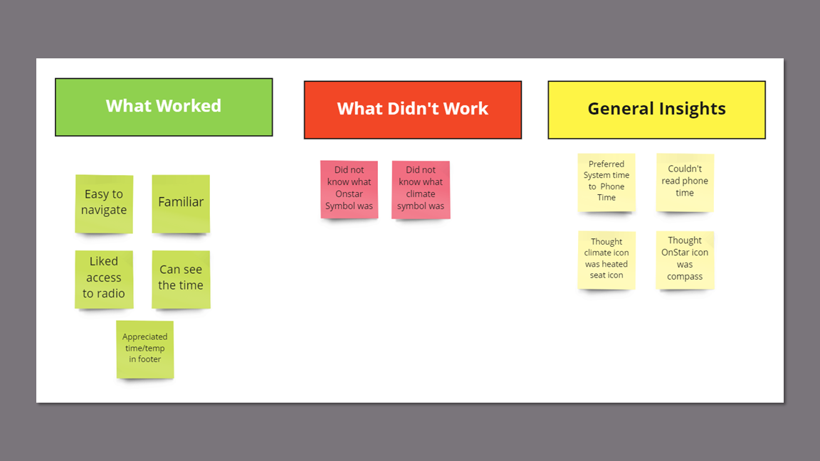 Five participants completed their sessions by sharing their screens over Zoom or Microsoft Teams. Two completed the testing session in person in the driver seat of their Blazer. For this, I attached an iPad to the dashboard over the existing multimedia display to make the experience as authentic as possible.