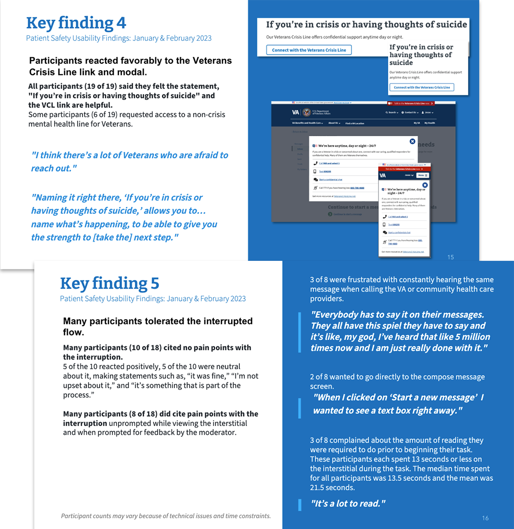 I conducted moderated remote usability testing via Zoom with 19 Veterans across desktop, tablet, and mobile devices. Sessions took place from January 27 to February 7, 2023, and focused on evaluating the new interstitial screen and patient safety messaging flow.